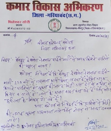 कमार विकास अभिकरण गरियाबंद के सदस्य पिलेश्वर सोरी ने गरियाबंद जिला के कलेक्टर नीलेश क्षीरसागर एवं पुलिस अधीक्षक भोजराम पटेल को पत्र लिखकर मांग किया है कि मैनपुर देवभोग नेशनल हाईवे 130सी मे सड़क निर्माण के बाद सड़क किनारे साईड सोल्डर मे मुरम के बजाय मिट्टी डाल देने से हल्की बारिश के कारण मिट्टी मे दलदल व कीचड़ हो जाने तथा सड़क किनारे साईड सोल्डर मे गड्ढे हो जाने से आये दिनो वाहन नेशनल हाईवे फंस रही है और यात्रियो को भारी दिक्कतो का सामना करना पड़ रहा है तो दूसरी ओर इससे लगातार दुर्घटनाओं मे इजाफा हो रहा है। कमार विकास अभिकरण गरियाबंद के सदस्य पिलेश्वर सोरी ने गरियाबंद जिला के कलेक्टर नीलेश क्षीरसागर एवं पुलिस अधीक्षक भोजराम पटेल को मांग किया है कि सड़क किनारे साईड सोल्डर मे सुधार करवाया जाये जिससे लोगो को दुर्घटनाओं का सामना करना न पड़े और लोग सुरक्षित आना जाना कर सके।