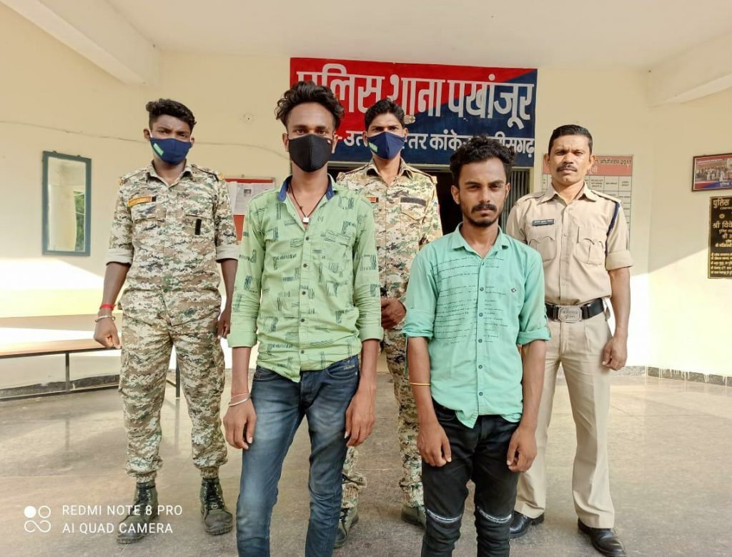 पखांजूर। पुलिस अधीक्षक कांकेर एम आर आहिरे के निर्देशन में अतिरिक्त पुलिस अधीक्षक कांकेर गोरखनाथ बघेल एवं अनुविभागीय अधिकारी पुलिस पखांजूर मयंक तिवारी के पर्यवेक्षण में थाना पखांजूर पुलिस द्वारा युवती से छेड़छाड़ करने वाले मनचले मोटरसाइकिल सवार आरोपियों को गिरफ्तार किया गया है मामले का विवरण इस प्रकार है कि पखांजूर थाना क्षेत्र की रहने वाली युवती ने पखांजूर थाने में दिनांक 26/06/21 को रिपोर्ट दर्ज़ कराया था कि वह अपने घर के सामने सड़क में टहल रही थी तभी एक मोटर सायकिल में सवार होकर 03 मनचले आरोपी युवती से छेड़छाड़ कर युवती अश्लील हूटिंग कर फ़रार हो गये थे, पीड़िता के रिपोर्ट पर मोटर साइकिल सवार आरोपियों को के विरुद्ध अपराध पंजीबद्ध कर विवेचना में लिया गया विवेचना के दौरान थाना पखांजूर पुलिस द्वारा आरोपीयो की पहचान कर घटना कारित करने में शामिलआरोपी गणेश कविराज पिता लक्ष्मी कांत कविराज उम्र 21 वर्ष निवासी पिव्ही 14 एवं रंजीत हालदार पिता विश्वजीत हालदार उम्र 20 वर्ष निवासी पिव्ही 129 एवं को गिरफ्तार किया है आरोपियों के कब्जे से घटना में प्रयुक्त मोटरसाइकिल भी जप्त किया है आरोपियों को जेल भेजा गया है घटना कारित करने में शामिल 01अन्य नाबालिग विधि से संघर्षरत बालक के विरुद्ध भी वैधानिक कार्यवाही किया जा रहा है, थाना पखांजूर की कार्यवाही।