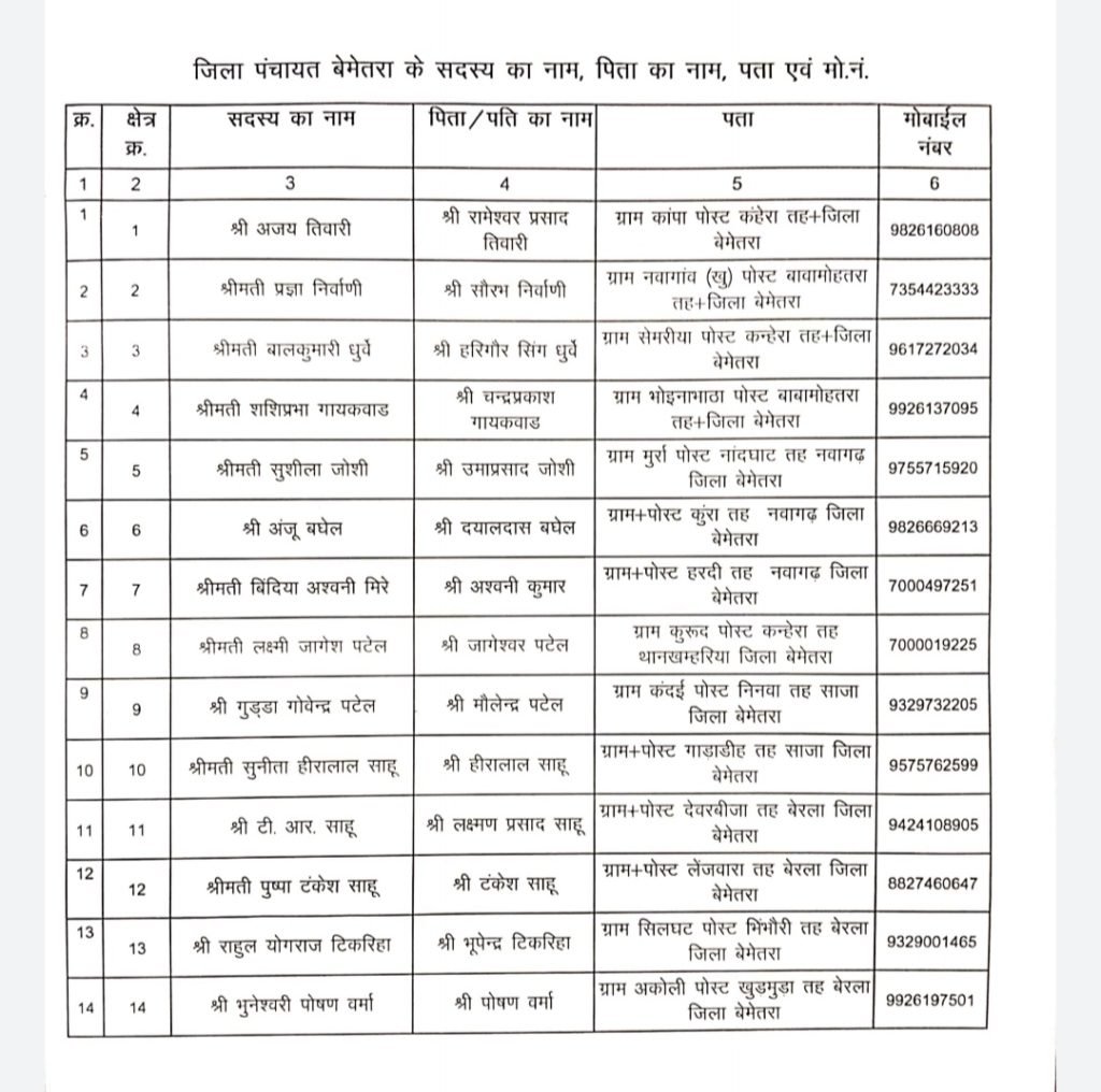 बेमेतरा. जिला पंचायत बेमेतरा के अंतर्गत 7 स्थाई समिति का गठन किया गया है, जिसके सभापति एवं सदस्यों के नाम इस प्रकार है-कृषि समिति के सभापति अंजू बघेल, सदस्य श्रीमती भुनेश्वरी पोषण वर्मा, गुड्डा गोवेन्द्र पटेल, शिक्षा समिति के सभापति अजय तिवारी(उपाध्यक्ष जिला पंचायत, पदेन सभापति) सदस्य श्रीमती बिंदिया अश्वनी मिरे, गुड्डा गोवेन्द्र पटेल, संचार एवं संकर्म समिति के सभापति राहुल योगराज टिकरिहा, सदस्य अंजू बघेल, श्रीमती पुष्पा टंकेश साहू, सहकारिता एवं उद्योग समिति के सभापति श्रीमती पुष्पा टंकेश साहू, सदस्य श्रीमती बिंदिया अश्वनी मिरे, श्रीमती भुनेश्वरी पोषण वर्मा, महिला, बाल कल्याण एवं स्वास्थ्य समिति के सभापति श्रीमती भुनेश्वरी पोषण वर्मा, सदस्य अंजू बघेल , श्रीमती पुष्पा टंकेश साहू, वन समिति के सभापति गुड्डा गोवेन्द्र पटेल, सदस्य श्रीमती लक्ष्मी जागेश पटेल, राहुल योगराज टिकरिहा, स्वच्छता समिति के सभापति श्रीमती बिंदिया अश्वनी मिरे, सदस्य राहुल योगराज टिकरिहा, टी.आर. साहू।
