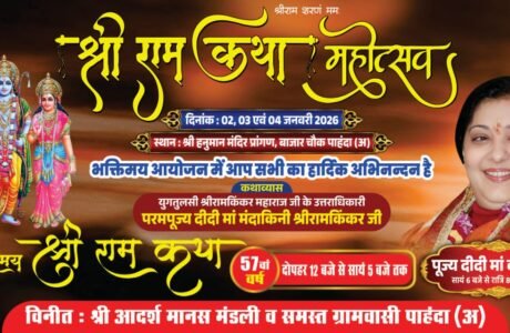 पाटन। श्री हनुमान मंदिर प्रांगण, बाजार चौक पाहंदा में 02, 03 एवं 04 जनवरी 2026 को भव्य श्रीराम कथा महोत्सव का आयोजन किया जा रहा...